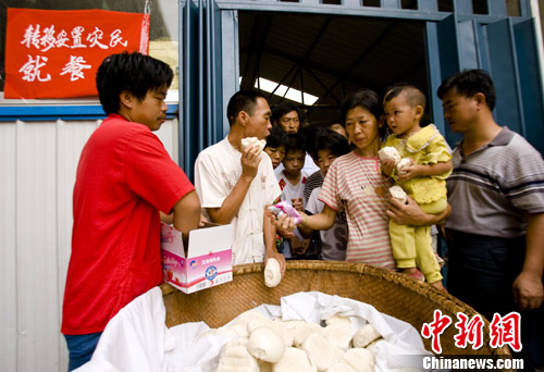 7月27日,河南淅川县第一小学安置点,灾民在领取早餐馒头和牛奶,当日共有400余名灾民在该安置点领取早餐。中新社发 王中举 摄