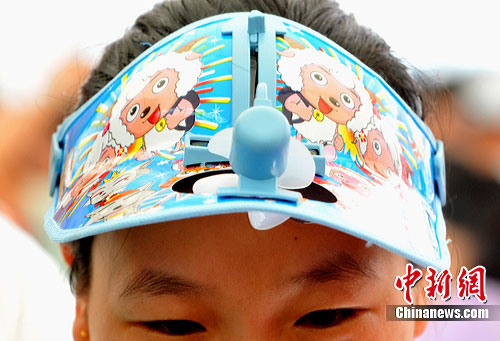 一款装有微型电扇的防暑遮阳帽在上海世博会热卖,今年7月下旬盛夏高温天气增多,人们纷纷设法避暑。中新社发 贾国荣 摄