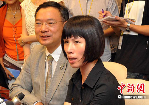 7月27日,因谩骂内地游客,引发社会广泛关注的香港女导游李巧珍(右),在立法会议员谢伟俊(左)及金凯国际旅游老板周文伟陪同下,首次向媒体交代事件,吸引大批媒体到场采访。中新社发 邓庆乐 摄