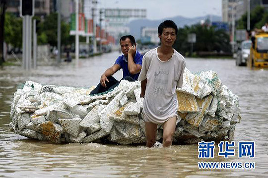 7月27日,温岭街头积水严重,市民利用泡沫塑料涉水出行。潘侃俊 摄