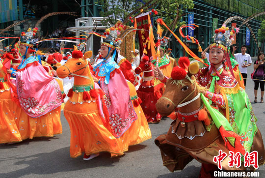 7月28日,具有700多年历史的广东民间舞蹈“布马舞”亮相上海世博园区,为世博广东活动周开幕助兴。中新社发 潘索菲 摄