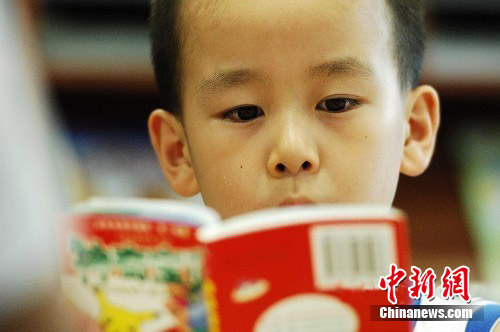 7月28日下午,一名孩子在位于北京的国家图书馆少年儿童馆内认真读书。中新社发 侯宇 摄