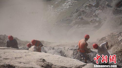 发生在5月29日213国道阿坝州汶川县雁门乡索桥村路段山体大面积滑坡垮塌事故中,因地形结构复杂、地理位置险恶,经过两个月的抢修目前还未正式通车,目前,汶川交管部门只允许部分车辆从临时便道通行。图为7月28日工人正在悬崖施工。中新社发 张浪 摄