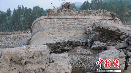 7月28日,搜救指挥部称经全力搜寻,又发现7具遇难者遗体。至此,发生于7月24日的河南省栾川县潭头镇汤营村伊河桥垮塌事件遇难者人数升至44人,仍有22名失踪者下落不明。图为躺在河床上的大桥桥墩。中新社发 豫分 供