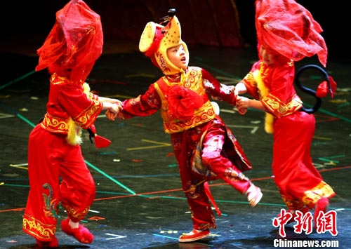 北京蓝天儿童艺术团7月28日晚在台北进行公益演出,所得善款将全部捐献给台南灾区。中新社发 宋吉河 摄