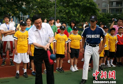 7月28日下午,由来自台湾“9·21”地震灾区和“8·8”风灾灾区的125名师生组成的“台湾学生天府夏令营”正式开营,中共四川省委书记刘奇葆出席开营仪式并与大家一起看节目、打乒乓等。本次“台湾学生天府夏令营活动”为期6天,台湾学生还将前往北川“5·12”地震灾区和熊猫基地等地参观学习。图为刘奇葆来到棒球场在川台学生指导下打棒球。 中新社发 刘忠俊 摄