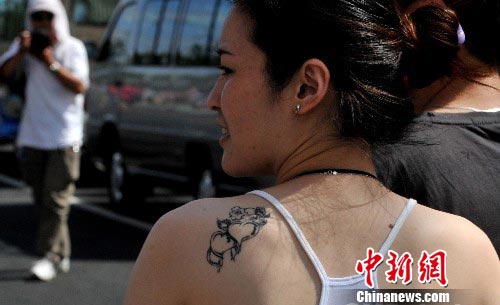 7月下旬,一位女子参观上海世博会时,以简洁的露背衫应对高温酷暑天气,同时展示出时髦的刺青图案。中新社发 贾国荣 摄