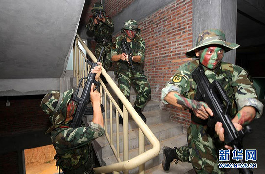 7月27日,在武警东莞训练基地,反恐特战队员进行巷战训练。陈帆 摄
