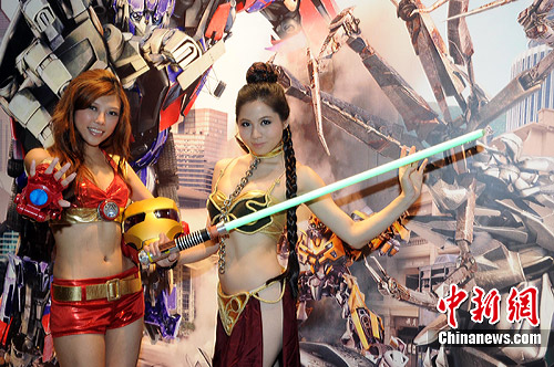 充满欢乐和活力的“2010第12届香港动漫电玩节”于30日在会展中心开幕。主办机构于7月29日下午,组织各传媒率先窥视今届最新、最具创意的信息。图为模特区咏诗(左)、罗凤章(右)正应邀为一款动漫电玩支招。中新社发 郑祚声 摄