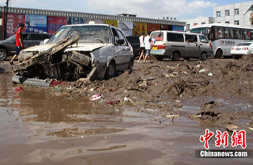 吉林市永吉县28日遭遇特大洪灾,整座县城被淹,目前已发现13具遇难者尸体,另有多人失踪。29日下午,随着洪水渐渐消退,永吉县城内大部分灾民已经展开自救,一些商铺经营者开始清理洪水过后留下的淤泥。图为洪水中被损坏的汽车。中新社发 张策 摄