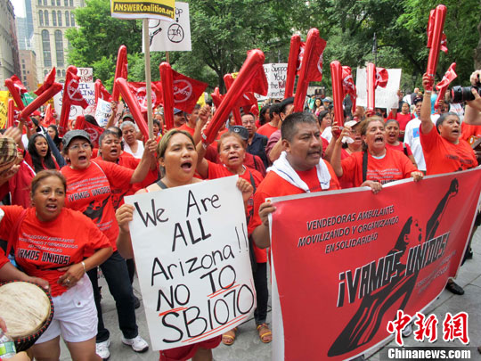 “移民之都”纽约29日爆发大规模游行,抗议美国亚利桑那州于当天生效的严苛“反移民法”。