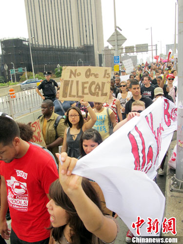 “移民之都”纽约29日爆发大规模游行,抗议美国亚利桑那州于当天生效的严苛“反移民法”。数千名来自纽约的各族裔非法移民及其支持者沿着著名的布鲁克林大桥徒步,高举“我们都来自亚利桑那”、“给非法移民生路”等条幅请愿。中新社发 魏晞 摄