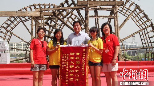 7月30日,30名海外华裔青少年结束了在甘肃的“寻根之旅”夏令营,三天以来,他们赴甘肃敦煌参观了莫高窟等历史文化遗迹,游览了月牙泉、鸣沙山等旅游景点。30日,他们在兰州水车博览园参加“闭营仪式”。图为夏令营领队和营员向甘肃省侨务办公室赠送锦旗“看祖国大好山河,谢亲人帮助寻根”。中新社发 殷春永 摄
