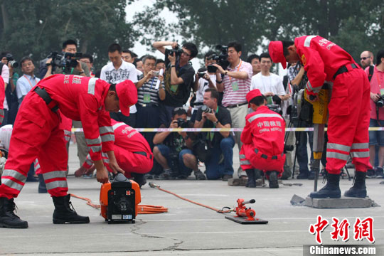 2001年北京军区工兵团和国家地震局、武警总医院共同组建中国国际救援队,自建队以来该队曾先后十多次奔赴国内外重灾区现场救援。当日工兵团向媒体展示了多种救援装备和搜救犬等,并进行了地震现场救援演练。