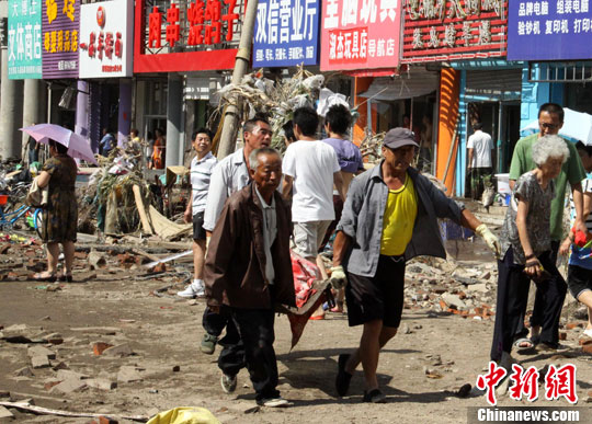 7月28日,吉林市永吉县遭受特大洪灾,整个县城被淹,目前已知有13人遇难。洪灾过后,当地居民和救援人员一起展开灾后救援。图为29日,一名遇难者遗体被抬走。中新社发 张策 摄