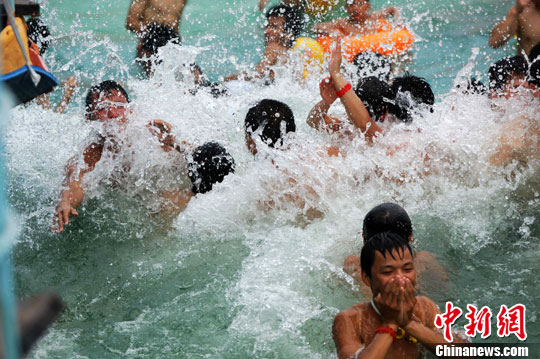 继29日发布今年首个高温红色预警后,7月30日重庆市气象部门连续第二天发布高温红色预警称,包括重庆主城区在内的20个区县气温将超40℃,众多当地市民纷纷前往泳池觅清凉。中新社发 郭晋嘉 摄
