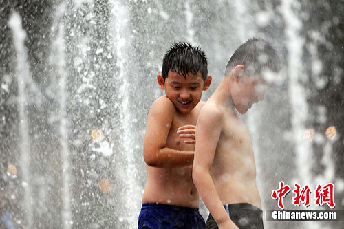 7月30日,北京依然高温不退,从23日开始连续7天日最高气温在35℃上下,创近10年来7月高温日数最多纪录。图为北京朝阳一处街头喷泉,几个放暑假的北京小学生在此戏水纳凉。中新社发 刘震 摄