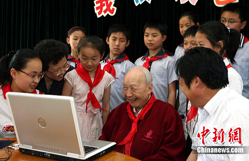 7月30日,著名科学家、上海大学校长钱伟长教授早晨在上海逝世。图为2007年5月14日,钱伟长第12次回到母校——江苏无锡荡口中心小学,受到师生们的欢迎。中新社发 顾祚维 摄