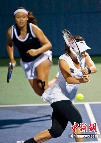 当地时间7月30日深夜,WTA“西部银行杯”网球精英赛,美国斯坦福大学网球中心,海峡组合郑洁/詹咏然在40分钟内以两个6:0淘汰美国组合克雷巴斯/古丽克森晋级4强。图为郑洁/詹咏然在比赛中。中新社发 陈钢 摄