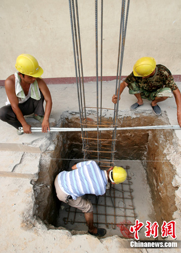 暑假期间,当地工人师傅冒着酷暑对侯马市高村乡下平望村的学校进行抗震加固。 据了解,今年,山西省侯马市将投资7220余万元,对全市38所中、小学校舍进行加固和改造,总面积约10.6万平方米。 张跟慧 摄