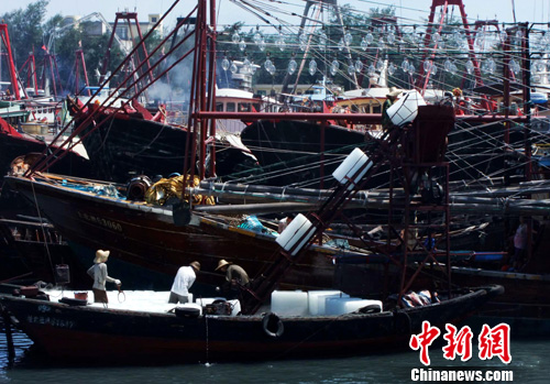8月1日,广西最大的渔港北海市电建渔港的渔民加紧运冰,给即将出海的渔船补充渔需物资。当天午间12时,为期二个半月的第12个中国南海海域伏季休渔期宣告结束,北海、钦州、防城港等广西沿海大部分渔民纷纷驾船出海,争捕首网鱼虾;尚有部分选择滞留港内的渔民则表示将“另择吉日”出海。中新社发 田菊 摄
