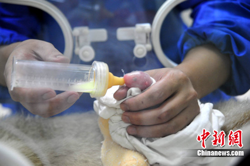 8月1日凌晨,卧龙中国保护大熊猫研究中心大熊猫“水秀”首次生产,诞下了一对双胞胎大熊猫,目前母子平安。中新社发 卧龙中心 供图