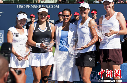 当地时间8月1日下午,美国加州斯坦福大学网球中心,WTA“西部银行杯”网球精英赛双打决赛中,郑洁/詹咏然与东道主达文波特/胡贝尔对决,以1:2惜败,三盘比分为5:7,7:6和8:10。图为冠亚军在颁奖仪式上。