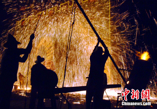 8月1日晚,河北张家口蔚县古镇--暖泉镇城墙下,钢花飞溅,将夜幕照耀得一片通明。当地民众进行的此项“打树花”活动,是将浸湿的柳木勺,飞速抛洒高温铁水于古墙堡上,制作出“火树银花”的景象。暖泉镇位于蔚县西部,“打树花”活动是当地古老的节日传统,至今已有300余年历史。如今,只有在远方贵宾到来之时,蔚县才以此高规格传统礼仪形式表示欢迎。中新社发 邹宪 摄