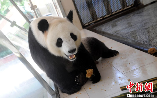 8月2日,福州局部气温超过38℃。福州熊猫世界的一只大熊猫在空调房内避暑品尝午餐。中新社发 刘可耕 摄