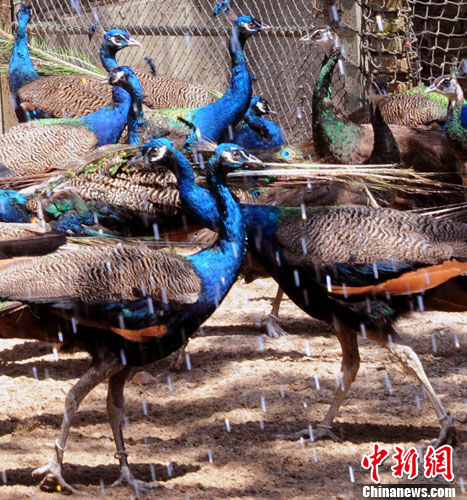 8月2日,福州局部气温超过38℃。福州国家森林公园鸟语林饲养员采用各种措施,让鸟儿们清凉度夏。图为该鸟语林孔雀们正在享受“冲凉”待遇。中新社发 刘可耕 摄