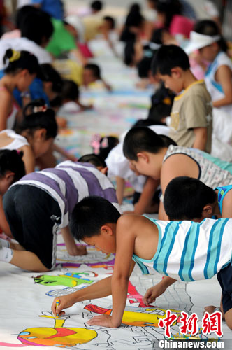 8月2日,一百名来自北京燕山少年宫的小画家来到国家网球中心,共同绘制了百尺网球为主题的长卷。作为中网大家庭中的重要一员,青少年在北京国际挑战赛场找到施展才智的舞台。中新社发 刘震 摄