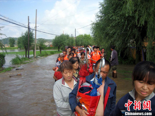 中新网吉林8月2日电(记者 苍雁)8月2日,因受特大洪水袭击的吉林市丰满区前二道乡在与外界隔绝多日后终恢复正常联络。据吉林市公安局二道派出所称,在被陷“孤岛”时,各部门均积极自救,将灾害损失降到最低程度。政府将受灾群众转移到安全地带。苍雁 摄
