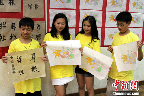 8月2日,来自美国、加拿大和乌克兰的70位海外华裔青少年,圆满结束“2010年海外华裔及港澳台地区青少年‘中国寻根之旅’夏令营”天津地区参访活动。图为几位美国小营员展示自己在夏令营中的书法、绘画作品。