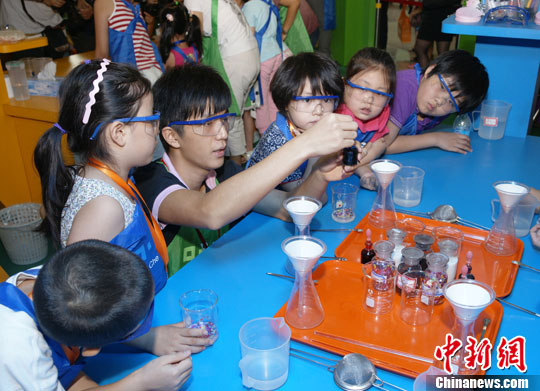 作为中国科技馆引进的德国互动教育活动“巴斯夫小小化学家”的内容,以倡导环保、低碳、可持续发展的生活方式为宗旨,鼓励孩子从日常生活做起保护环境。图为北京小学生们正在辅导员(左3)的帮助下做“滤纸色谱法”的化学小实验。中新社发 曾利明 摄