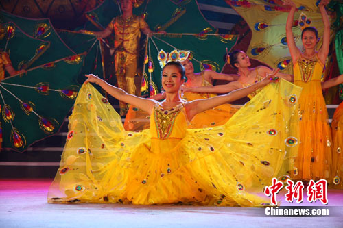 8月4日,云南楚雄彝族国际火把节开幕式在楚雄彝族自治州体育馆举行,来自当地各民族的演员献歌献舞,共同欢庆盛大的节日。中新社发 任东 摄