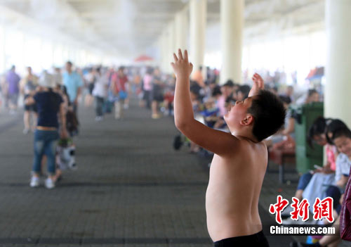 8月4日,上海发布高温超过37℃橙色预警,一位世博小游客在园区的喷雾中找清凉。上海自7月29日出现36.3℃的高温后,气温连日刷新今夏记录,一度攀升至39.6℃。