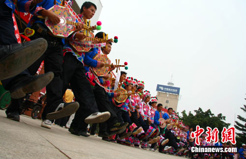 8月4日,云南各族民众迎来一年一度的彝族传统节日——火把节。图为楚雄市桃源河广场上,来自各地的嘉宾、游客,与当地彝族人一道,身着节日盛装,手拉手跳起传统歌舞。