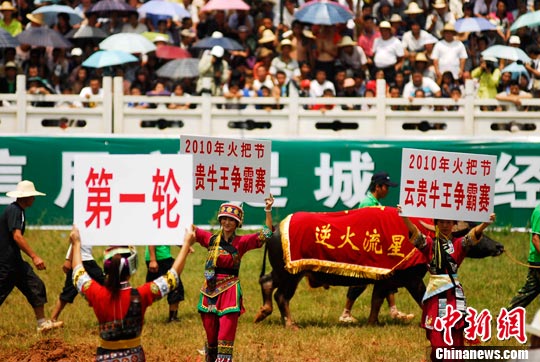 8月4日,2010中国石林国际火把狂欢节如期举行。期间举行彝族第一村斗牛比赛吸引不少前来参加火把节的游客的眼光,也为火把节增色不少。图为身着少数名族服装的礼仪小姐在赛场内为“牛王”们报场。中新社发 田洪 摄