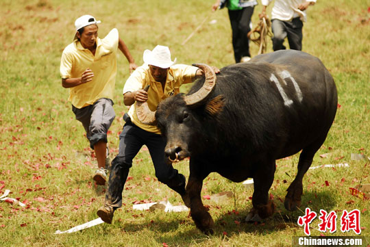 图为赛场工作人员正抑制一头“胜牛'的狂奔。中新社发 田洪 摄