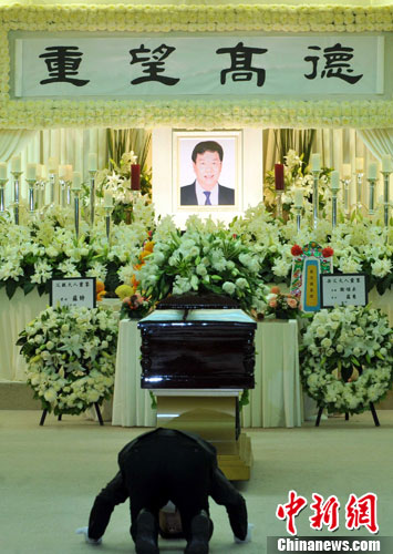 8月4日,香港乐坛教父戴思聪中午在香港举殡。戴思聪桃李满门,艺人陈晓东在灵堂上向恩师戴思聪叩首跪拜,作最后告别。中新社发 邓庆乐 摄