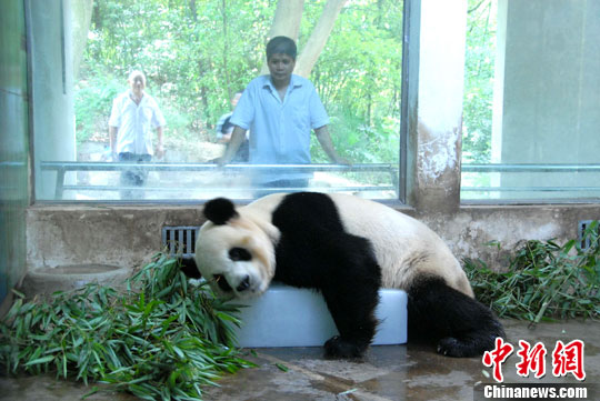 卧冰块、滚湿泥、吃西瓜、用空调、冲凉水,面对晴热高温,移地饲养在武汉动物园里,来自天南地北的野生动物降温各有高招。大熊猫伟伟扒在冰块上午休。何志华 摄