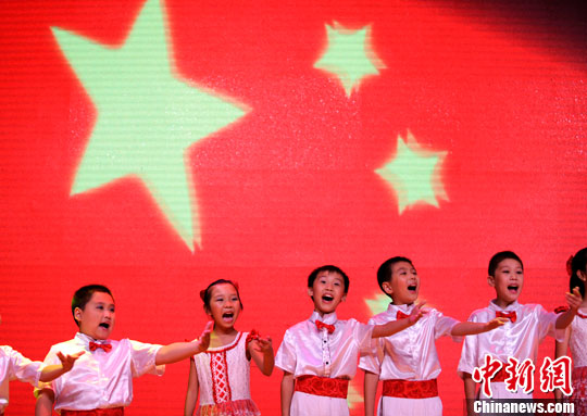 8月4日,小朋友在北京国图音乐厅显示着国旗的大屏幕前合唱歌曲。当日,第二届魅力校园合唱汇演在北京举行,来自全国各地的大、中、小学,青少年宫的优秀校园合唱团将集结北京,唱响希望之歌。中新社发 廖攀 摄