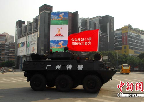 8月4日,广州亚运会进入倒计时100天,一部执行亚运安保任务的警车在广州街头驶过。中新社发 柯小军 摄