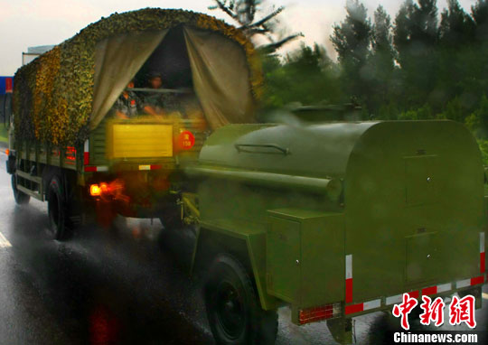8月5日上午,济南战区“前卫--2010”防空部队单元合成演练正在进行中,一支防空高炮部队冒雨实施阵地转移。在演练前三天的检验性阶段,重点实施了紧急疏散、作战筹划、侦察预警、信息对抗、对空抗击、指挥所、阵地转移等作战演练。中新社记者 宋吉河 摄