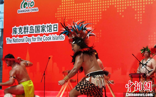 上海世博会8月5日迎来库克群岛国家馆日,库克群岛的艺术家们头戴鲜艳的羽毛,身着特色服饰,带来充满太平洋“岛国”风情的原生态舞蹈庆祝国家馆日。陈婷婷 摄