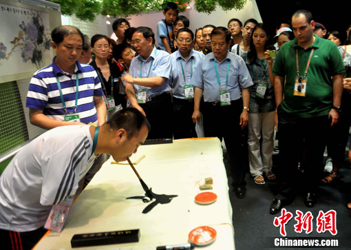 用口写字用脚作画 广西残疾人艺术家技惊世博园