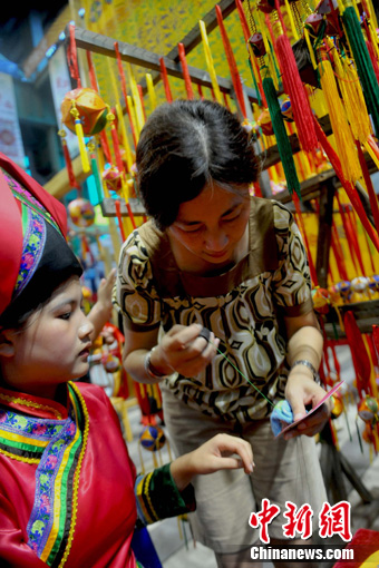 8月5日,上海世博园区内首个夏日游园会在宝钢大舞台举行。当天正值广西活动周,游园会具有浓郁广西特色。图为游客纷纷体验绣壮族绣球。 中新社发 蒋雪林 摄