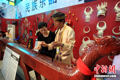 8月5日晚,上海世博会推出中国元素缤纷夏夜主题游园会,一架5米长的广西京族超大独弦琴亮相其传习区,吸引游客试弹。该京族独弦琴,具有有效弦长,可以演奏,目前正在申请世界吉尼斯纪录。 中新社发 潘索菲 摄