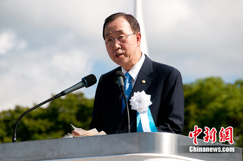 8月6日,联合国秘书长潘基文首次出席日本广岛原爆65周年纪念日和平祈愿仪式。中新社发 孙冉 摄