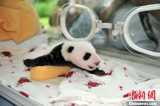 北京运往卧龙异地人工代哺的大熊猫宝宝满月(2)